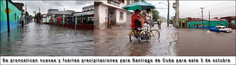 Luego de las persistentes e intensas lluvias en varios territorios de las provincias orientales, las que causaron al menos la perdida de dos vidas humanas y severos daños fundamentalmente en Guantánamo y Santiago de Cuba, las noticias para los santiagueros no son buenas, tomando en cuenta que se pronostica la continuación de más precipitaciones para la jornada del próximo 3 de octubre.
